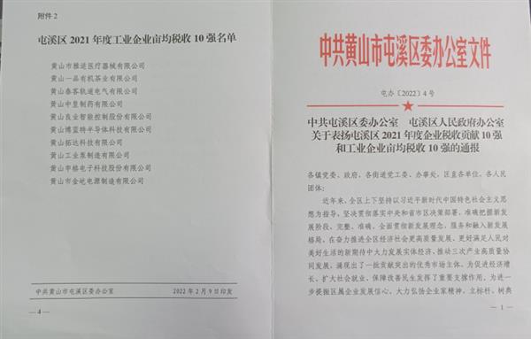 會(huì)上區(qū)委、區(qū)政府對(duì)屯溪區(qū)2021年度企業(yè)稅收貢獻(xiàn)10強(qiáng)和屯溪區(qū)2021年度工業(yè)企業(yè)畝均稅收10強(qiáng)企業(yè)予以通報(bào)表?yè)P(yáng)。我公司2021年畝均稅收15.56萬(wàn)元,榮獲屯溪區(qū)2021年度工業(yè)企業(yè)畝均稅收10強(qiáng)企業(yè)(排名第五)。