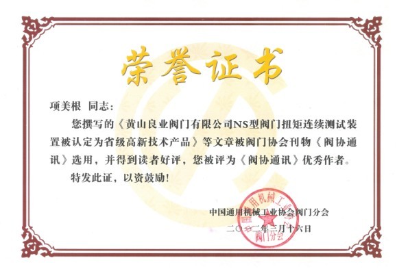 黃山良業(yè)閥門有限公司創(chuàng)辦20年來,董事長項美根同志一直十分重視企業(yè)的宣傳報導(dǎo)工作,并親自帶頭寫作,他寫的報導(dǎo)文章,很多都得到刊物的采用,并得到讀者的好評。最近,他被中國閥門協(xié)會評為《閥協(xié)通訊》優(yōu)秀作者稱號。