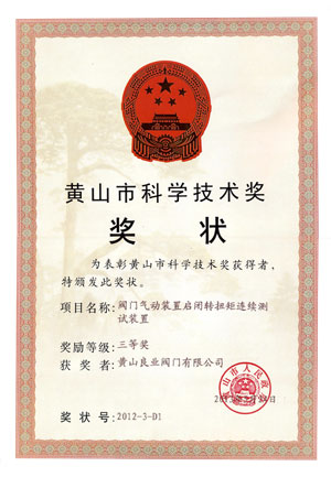 泵閥交易網(wǎng)訊 黃山良業(yè)閥門(mén)有限公司研制的“閥門(mén)氣動(dòng)裝置啟閉轉(zhuǎn)矩連續(xù)測(cè)試裝置”因其有多項(xiàng)技術(shù)創(chuàng)新和國(guó)家專利,并經(jīng)用戶使用證明具有良好的市場(chǎng)前景,最近經(jīng)黃山市科技局評(píng)審,榮獲2011-2012年度黃山市科學(xué)技術(shù)進(jìn)步三等獎(jiǎng)證書(shū)。