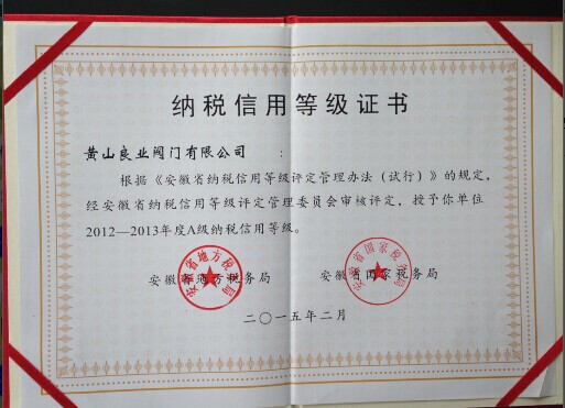 文章詳情2015年2月安徽省國(guó)家稅務(wù)局,安徽省地方稅務(wù)局,授予黃山良業(yè)閥門公司《2012-2013年度A級(jí)納稅信用等級(jí)證書》;這是企業(yè)第三次獲得這一榮譽(yù)。